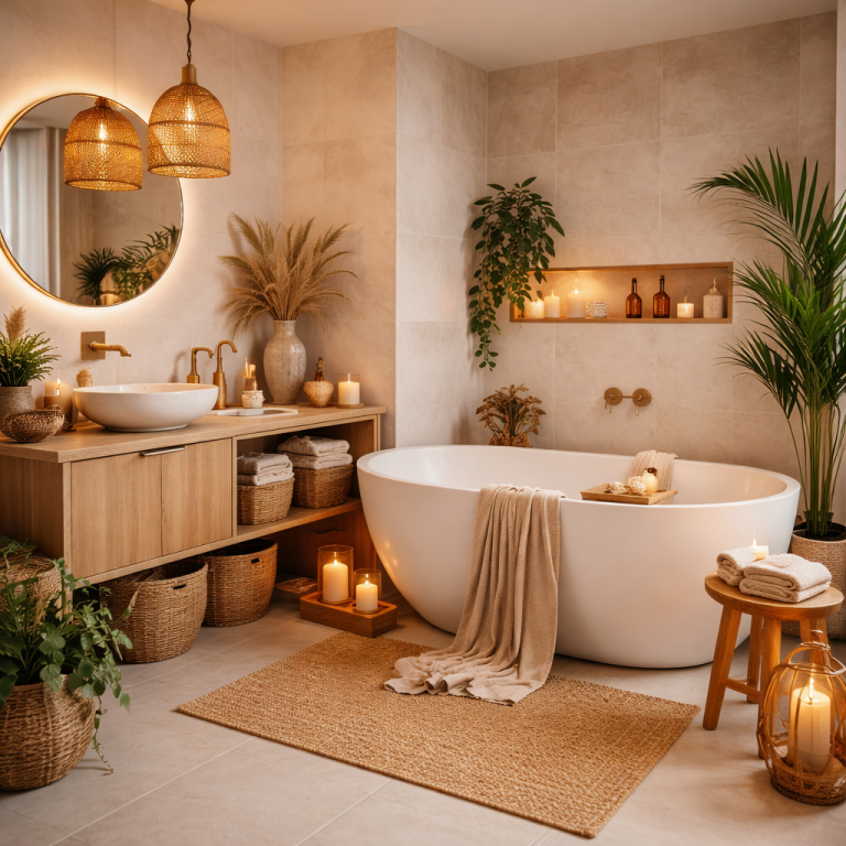 Dieses Badezimmer erzählt von Freiheit, Kreativität und einem entspannten Lebensgefühl. Warme Erdtöne, natürliche Materialien und liebevoll ausgewählte Details verbinden sich zu einem Raum, der lebendig wirkt und gleichzeitig Geborgenheit schenkt. Hier darf alles ein wenig ungezwungen sein – genau das macht den Boho-Stil so einladend und persönlich.